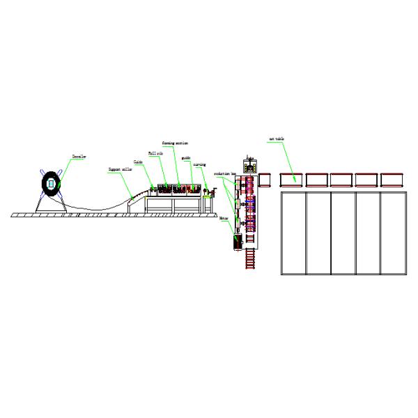 Coil car→hydraulic de-coiler→ support roller→guide→hydraulic pre-cutting →roll forming→seaming→curving→Plasma cutting →output table